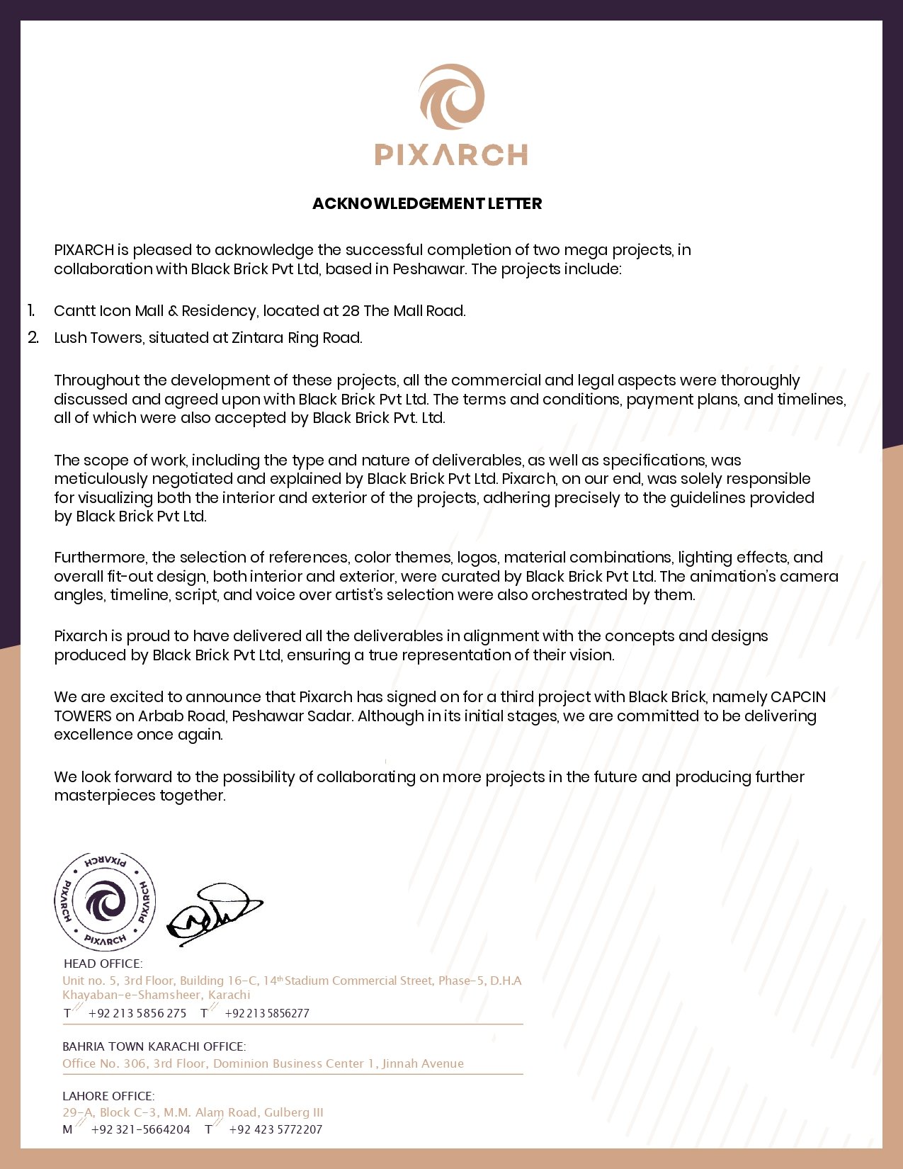 This letter acknowledges Pixarch’s successful collaboration with Black Brick Pvt Ltd on two completed projects and confirms a third upcoming project, while clarifying roles and responsibilities.